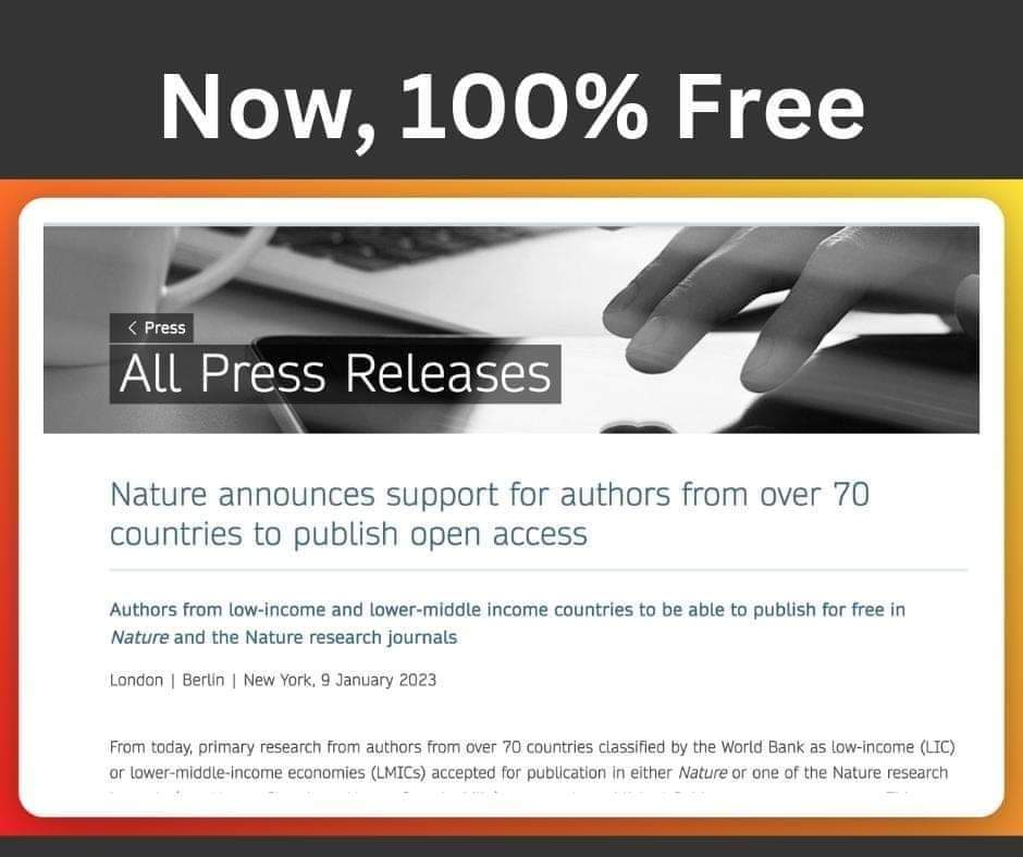Springer Nature announced a 100% exemption from international publishing costs in all Nature research Group journals.. for researchers from 70 low-income countries, including most Arab countries, including Egypt – Lebanon – Tunisia – Morocco – Algeria – Somalia – Afghanistan – South Sudan..